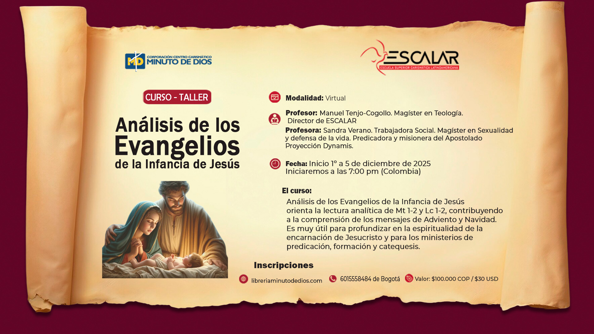 El curso: Análisis de los Evangelios de la Infancia de Jesús orienta la lectura analítica de Mt 1-2 y Lc 1-2, contribuyendo a la comprensión de los mensajes de Adviento y Navidad. Es muy útil para profundizar en la espiritualidad de la encarnación de Jesucristo y para los ministerios de predicación, formación y catequesis.